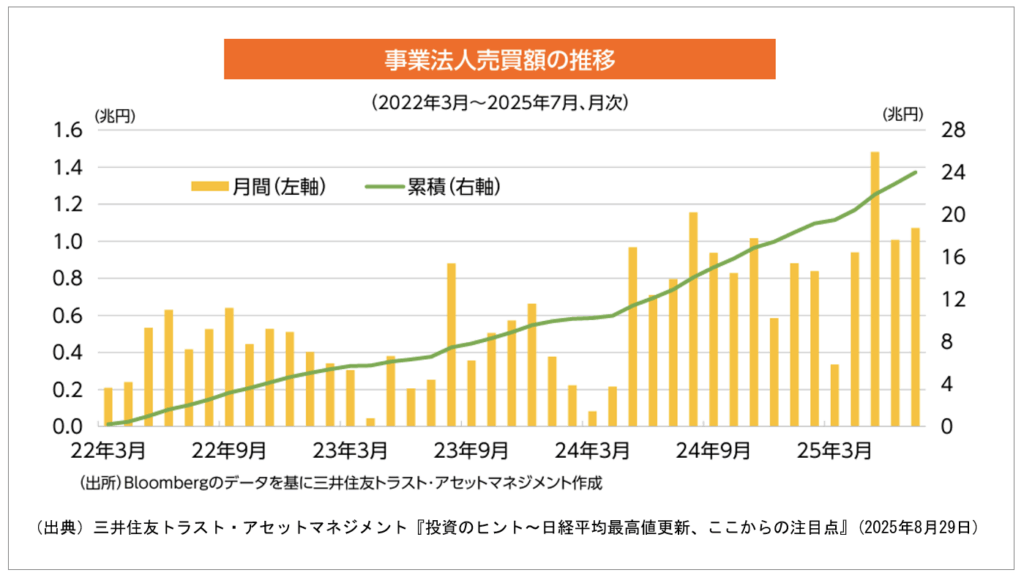 2013年から日本銀行が、2022年からは事業法人が日銀に代わって強烈に日本株を買ってきました。